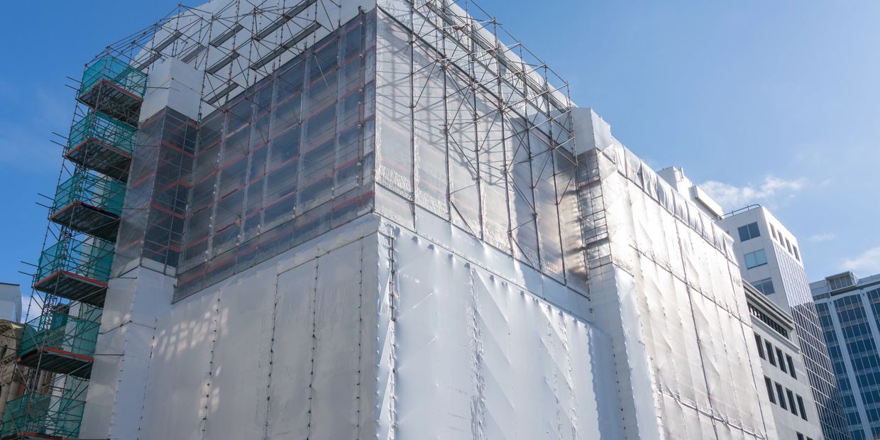 Scaffolding covered with SHRINK WRAP works well as a protective cover over large frameworks, roof installation that enables work during winter months. Rain, snow, hail or strong wind will not damage shrink wrap film. Between the building and the scaffolding a small oval structure is installed over the top of the scaffolding to cover with shrink wrap. Our thick micron SHRINK WRAP cover works well for covering scaffolding to totally enclose construction jobs. The cover is weather tight so temperatures can be controlled, it lets a good amount of light through and is much more durable than any other types of plastic sheeting in rain, snow and windy conditions.